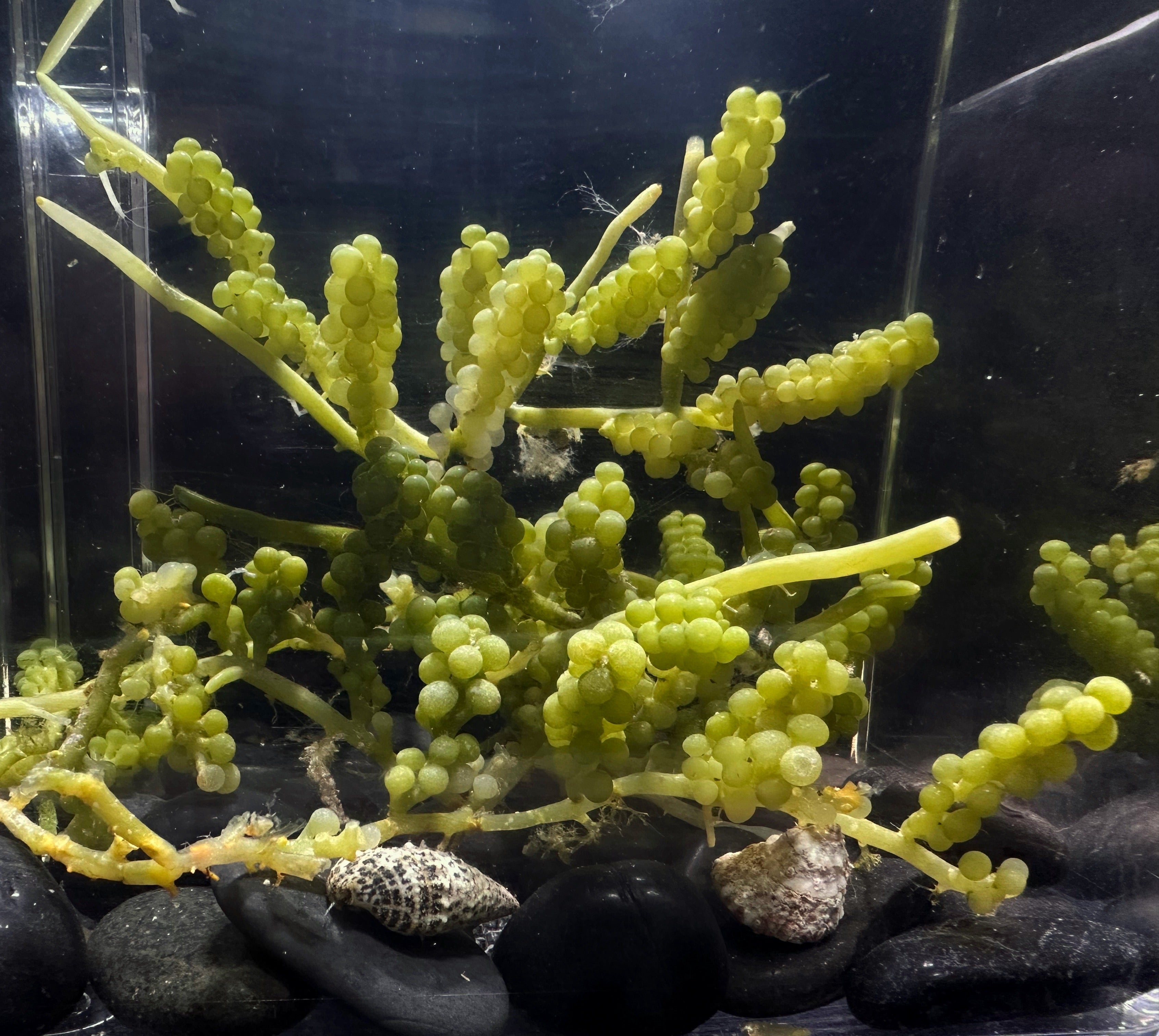 A popular, hardy species of caulerpa that does very well in the marine aquarium. Caulerpa racemosa is collected from the Atlantic ocean in shallow water. It features bright green clusters of round appendages attached by a single long rhizome. This species will grow in tall strands if given strong bright light and will remain more compact if exposed to a high current and partially shaded habitat.