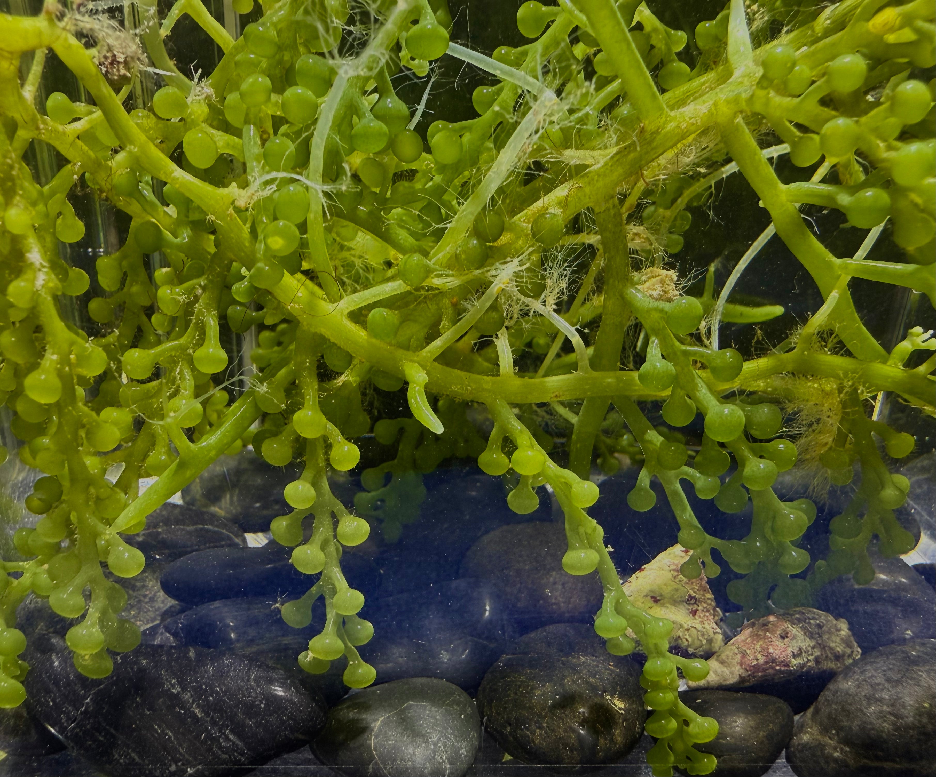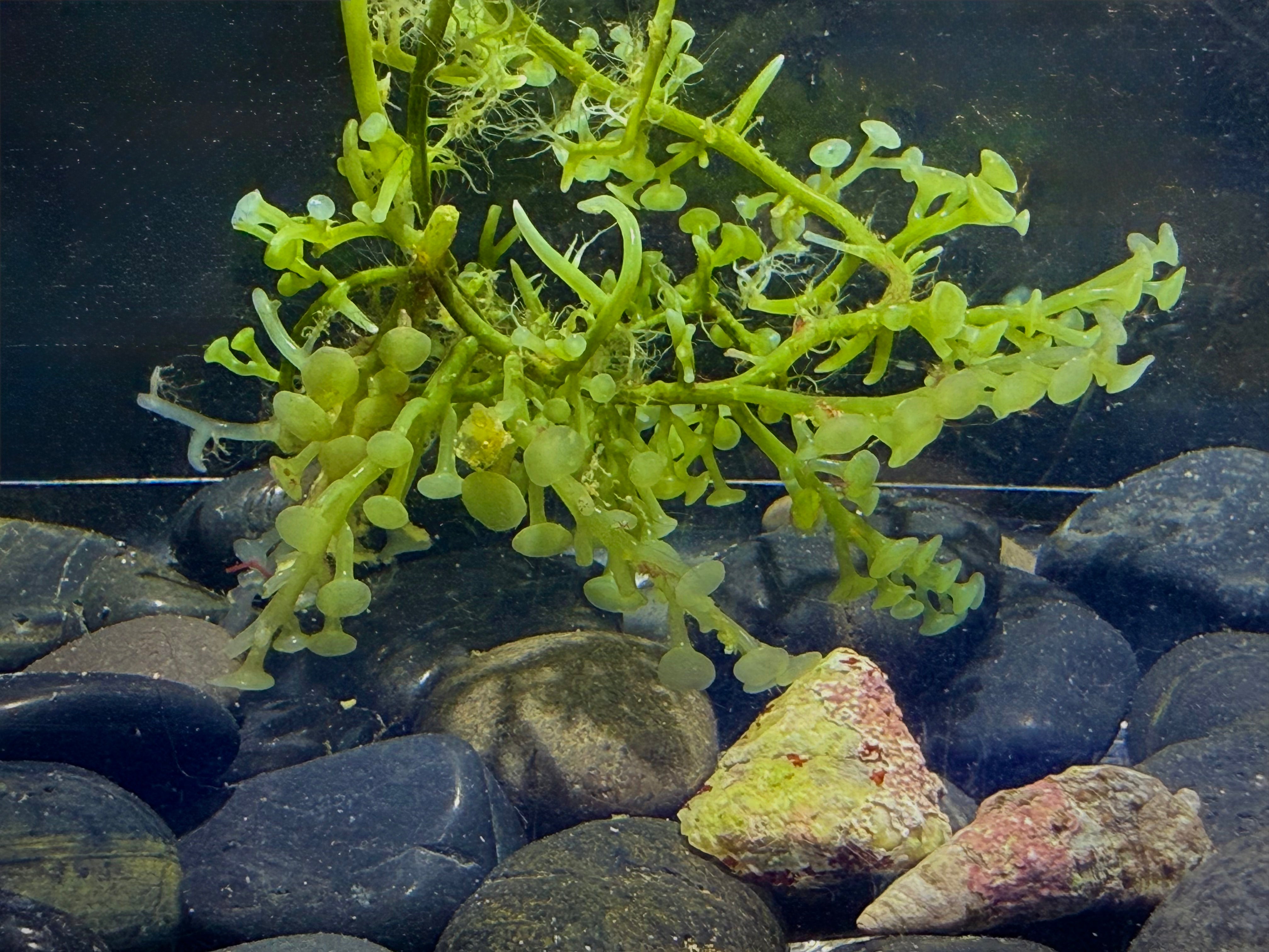 A beautiful, hardy, species that does very well in marine aquariums. Rhizoid-bearing rhizomes give rise to small flat topped umbrella shaped uprights. A distinctive variety usually found in low-light habitats under reef ledges and deep water habitats. We collect two varieties, one with rounded caps, the other with flat caps. It will grow in tall strands if given strong bright light and will remain more compact if exposed to a high current and partially shaded habitat. You will receive several portions that are 6-8" long.