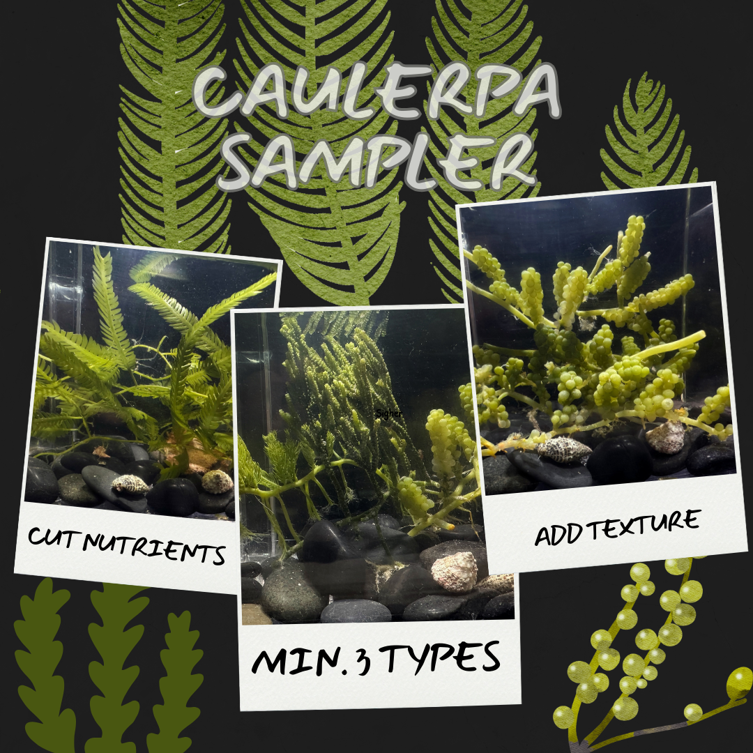 An assortment of various species of Caulerpa for the marine aquarium or refugium. The sampler pack contains at least 3 species of what is currently available. The species include: prolifera, mexicana, setularoides, racemosa, and others. Species of Caulerpa are by far the most efficient in removing excess nitrates and phosphates from aquarium water. Some species can release reproductive spores when they out grow available nutrients, so care must be taken to regularly prune and control growth. You will receive a portion that is approximately 1 pint.