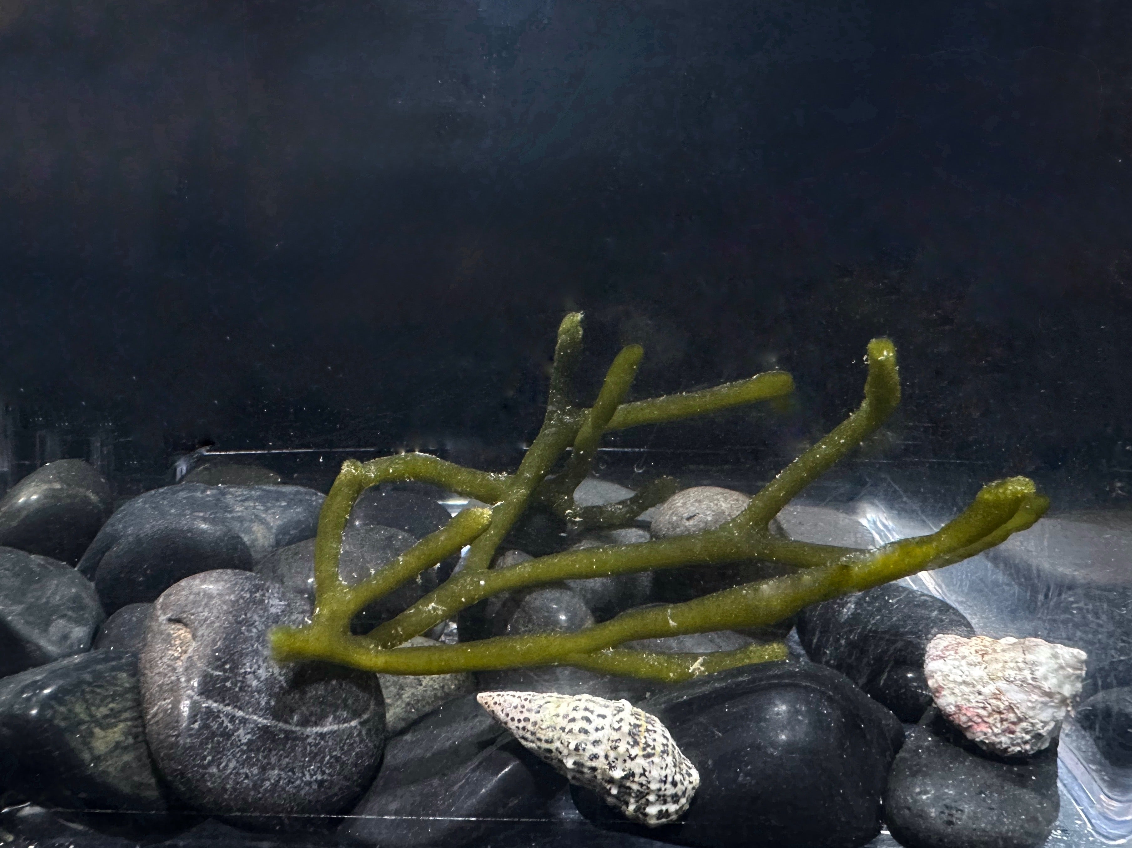 A spongy green alga that features dark green, cylindrical branches, connected by a single holdfast to rocks, shell fragments and hard bottoms. The branching is irregular and features soft fuzzy filaments at the tips resembling the fingers of a sponge. Individual species of Codium are abundant in shallow water habitats worldwide. A cooler water specimen that will not grow well in aquariums with temps above 80 degrees. This is a winter algae species that is only available a few months every year. You will receive a specimen approximately 3-4" in diameter.