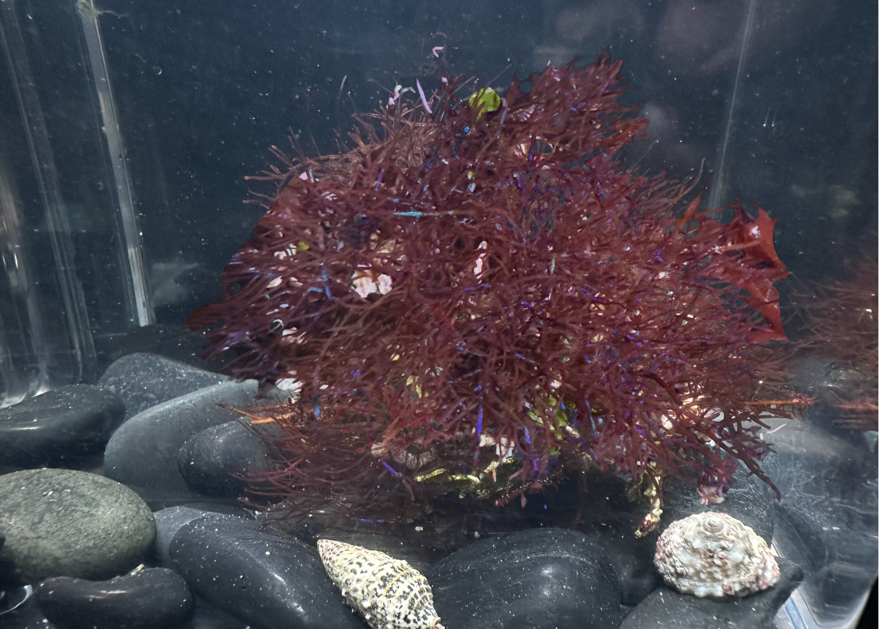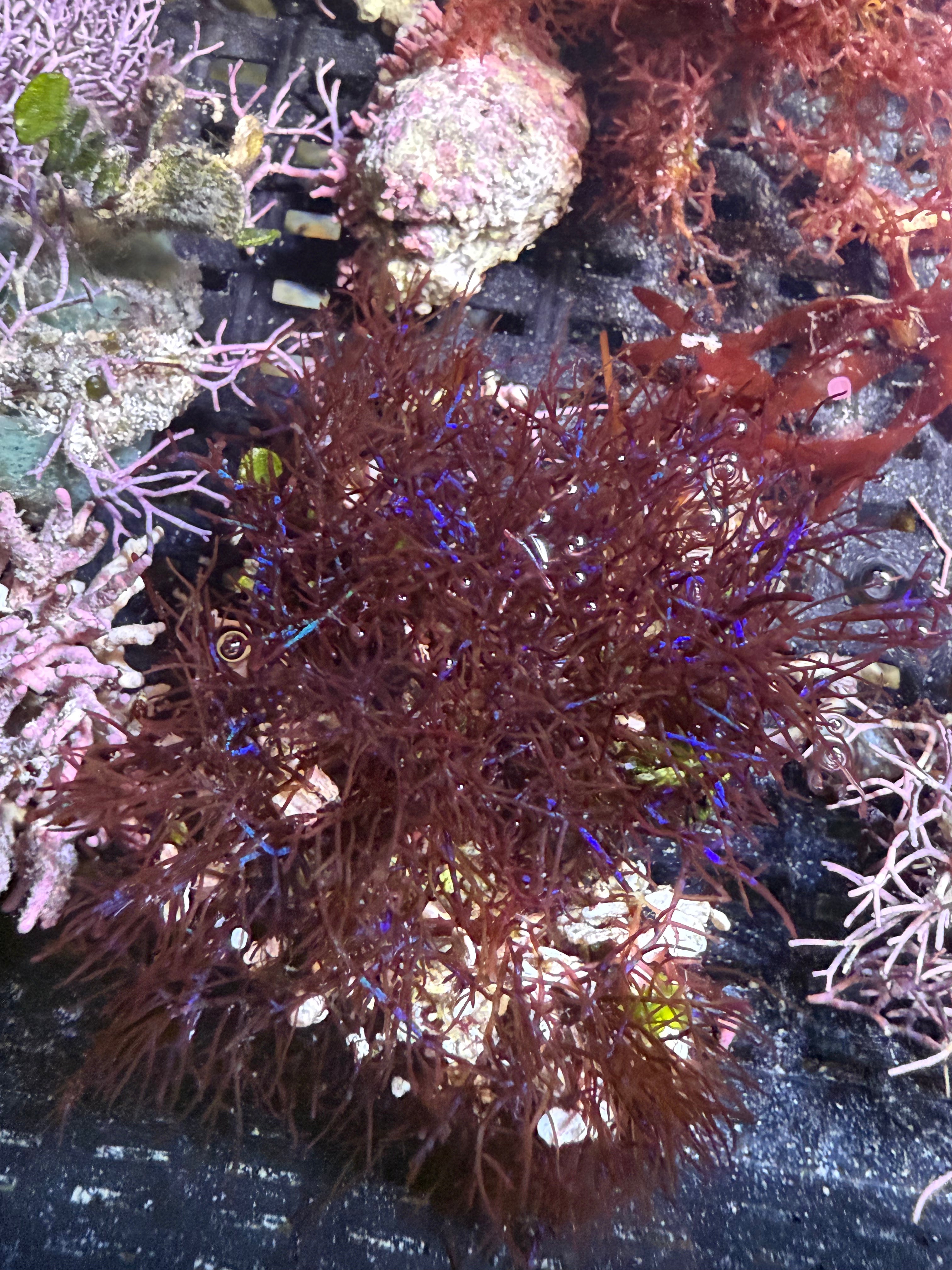 A very unique red macro algae species that features a stunning iridescent quality of blue and green when viewed at different angles. It's base coloration will vary depending on the lighting, but most specimens are reddish brown to green in appearance. It's an encrusting type of algae similar to Hypnea pannosa that grows in horizontal, dense clumps on hard bottom and in sandy substrate.Sold as a single specimen. Sizes vary between 3-4" in diameter.