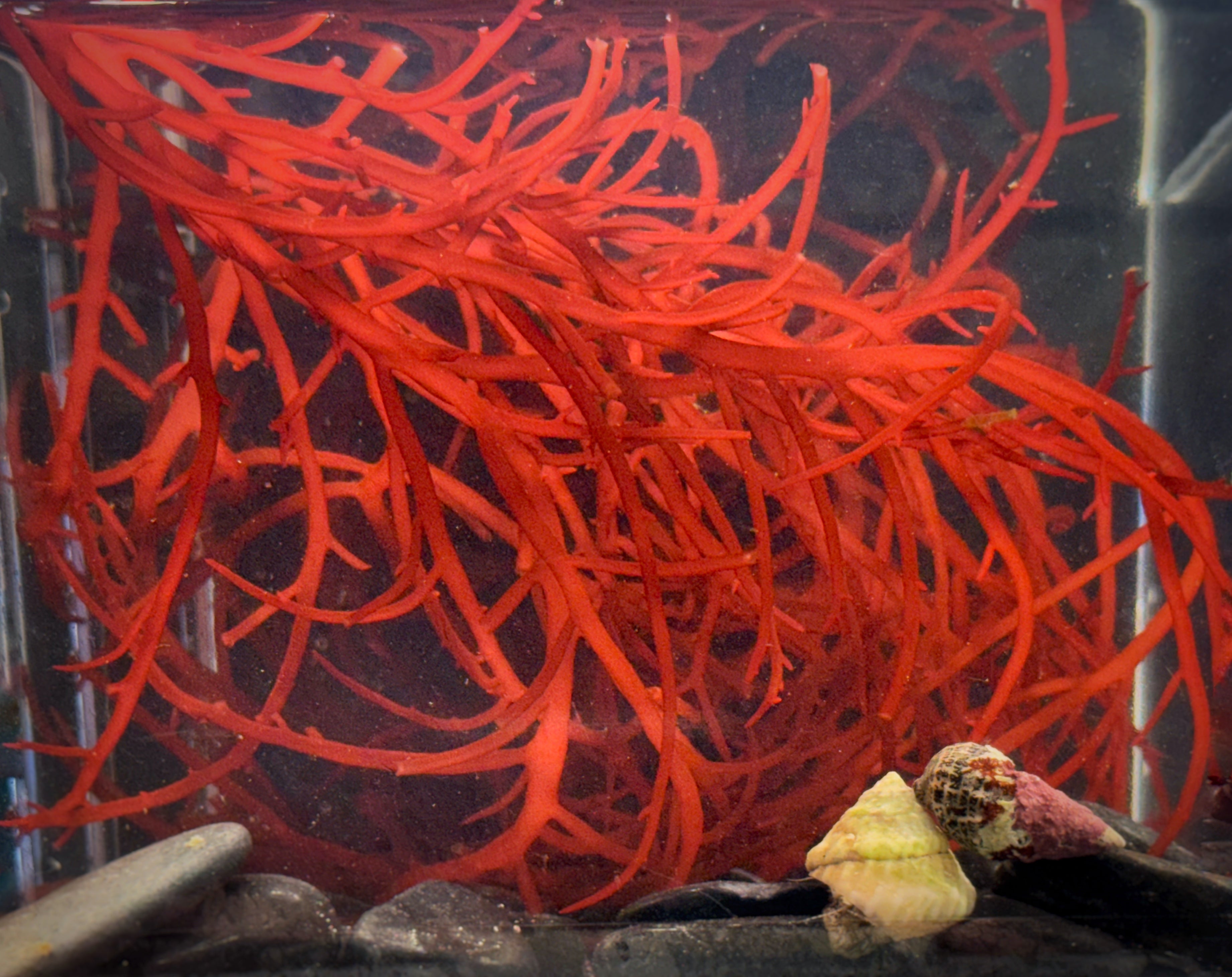 We collect and grow out several different species of red Gracilaria from the Gulf of Mexico. Each one is a little different, some with cylindrical branches, others with flattened fronds, all with beautiful irregular shapes. Because we follow the rhythms of the ocean, your Gracilaria selection will vary with the season. This allows us to offer unique specimens throughout the year.