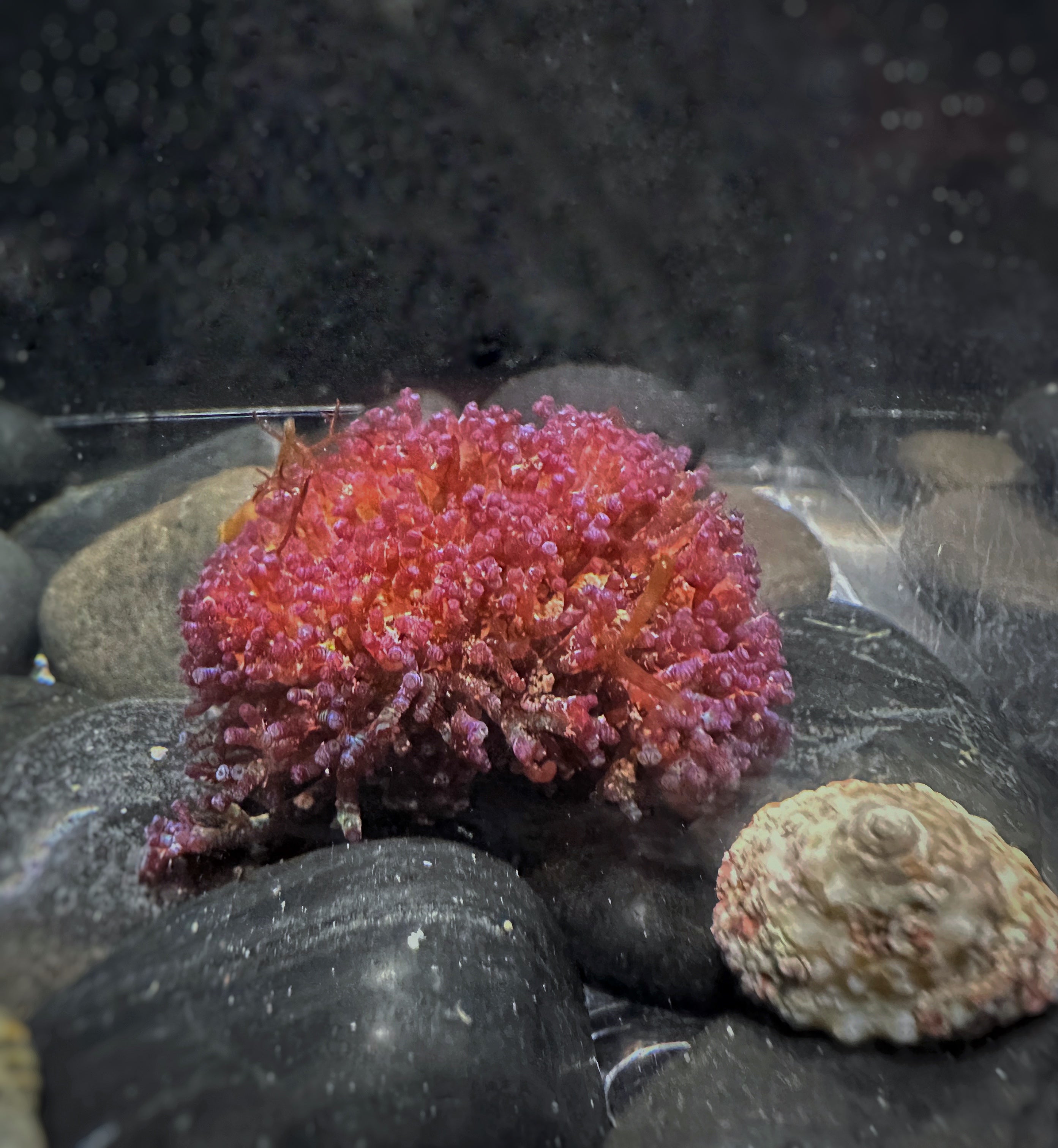 This is a smaller species of Laurencia that is found on hard bottom habitats to depths of up to 65 ft. It's native to both the Atlantic and Gulf of Mexico in Florida. This species prefers slightly cooler water temps in the mid to high 70's so it's not easily obtained so is somewhat rare. It features club shaped branches that form a tight clump. Each branch is slightly rounded at the tip and often exhibits an iridescent blue-greenish-purple coloration. We offer a single specimen that is 1.5-3" in diameter.