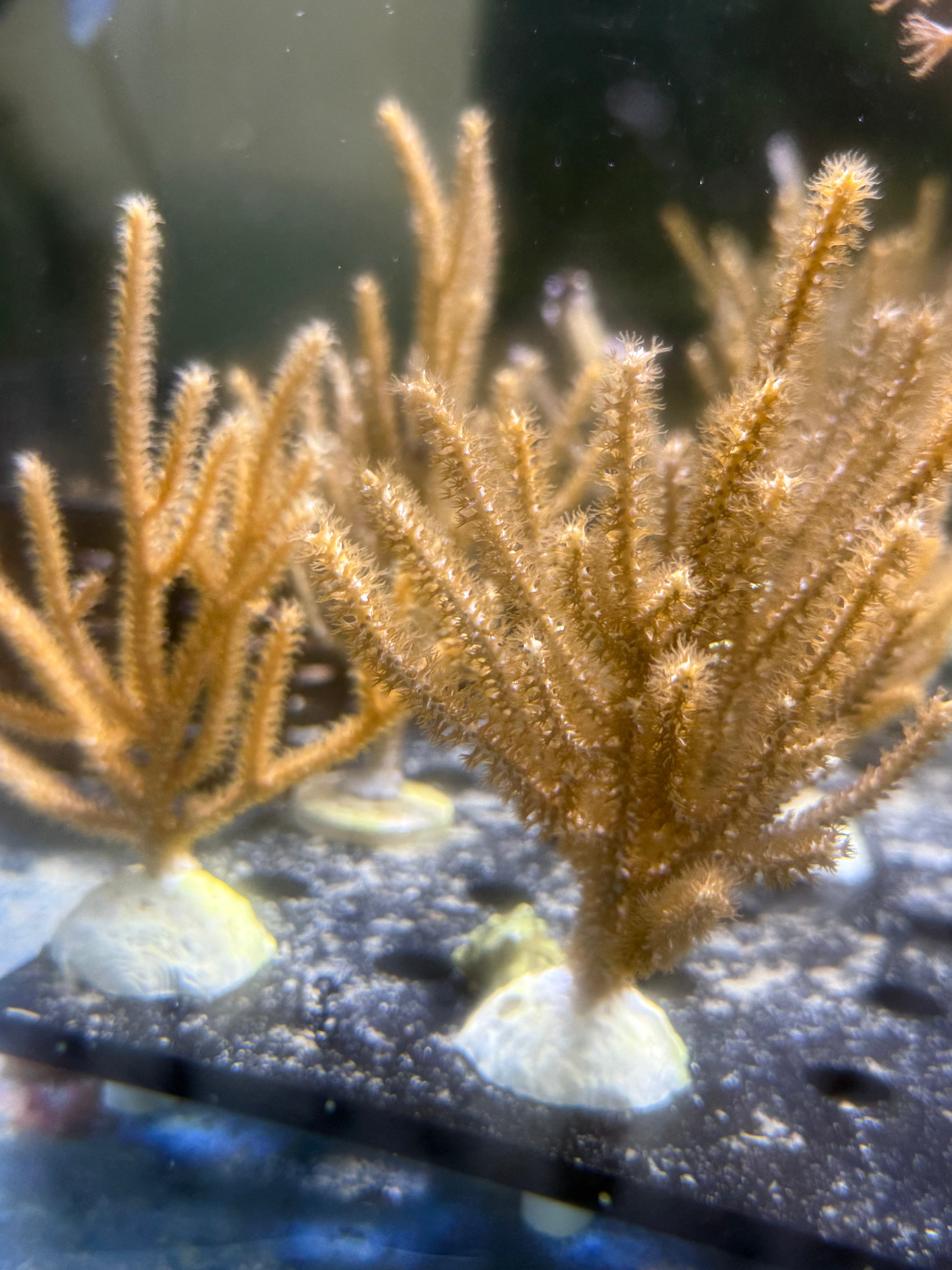 A beautiful photosynthetic gorgonian that features a tan or white coloration. It features stiff, sometimes spiny branches that remain erect with tan polyps. Gorgonians regularly shed tissue to remove buildup of sediment and algae from forming on their skeleton. All photosynthetic gorgonians require 4-5 watts per gallon to thrive. Like many corals it also filter feeds, so weekly feeding is recommended for optimal health. We offer single specimens mounted on reef plugs that range from 6-8" tall.