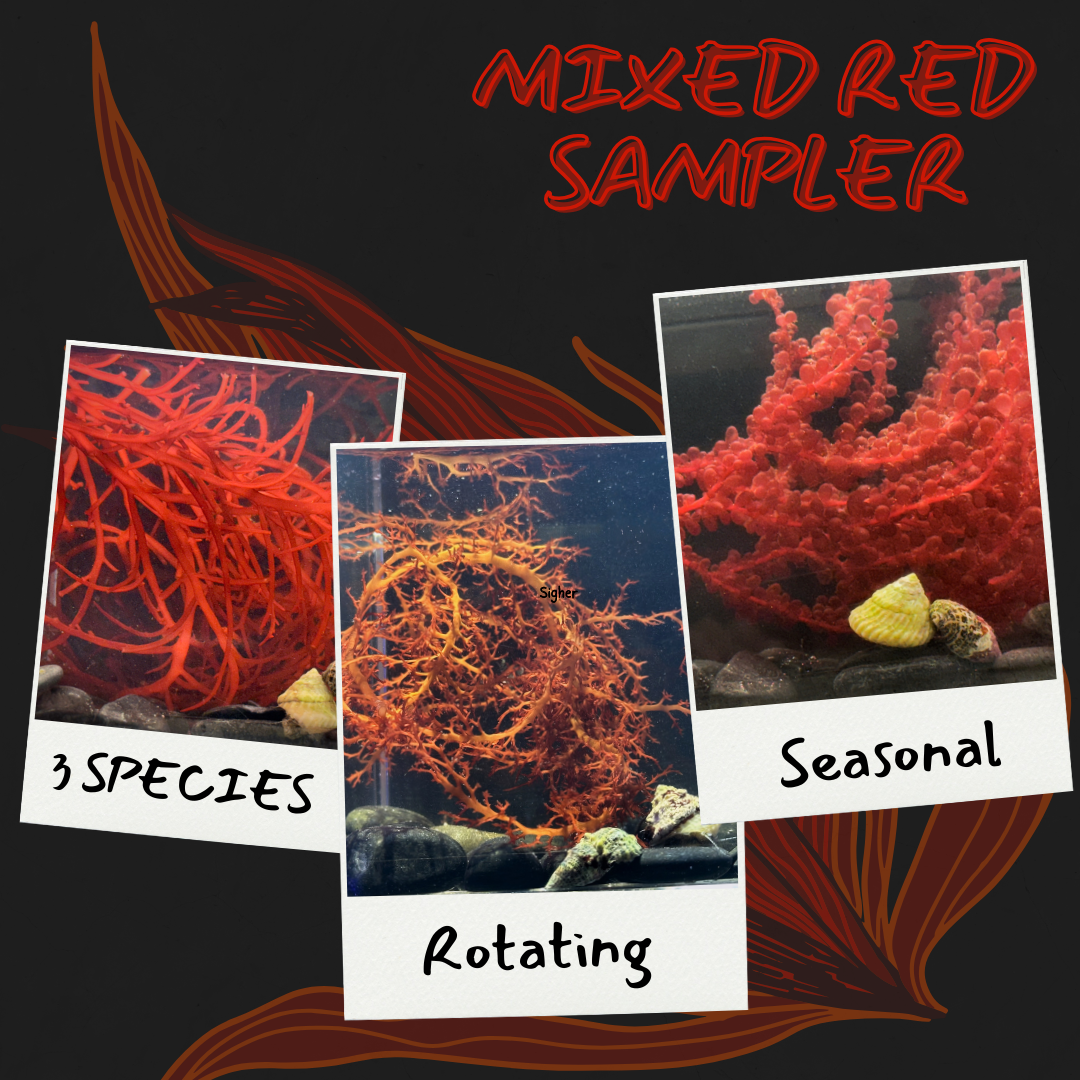 This red macro algae assortment is our best seller. It includes at least 3 species of red macro algae. We collect about 20 different species of red macro algae from both the Gulf of Mexico and Atlantic. Some species are rarely encountered and are only offered seasonally in the sampler pack, an excellent choice for refugiums and planted aquariums to add color and variation.The selection will vary depending on the season collected.