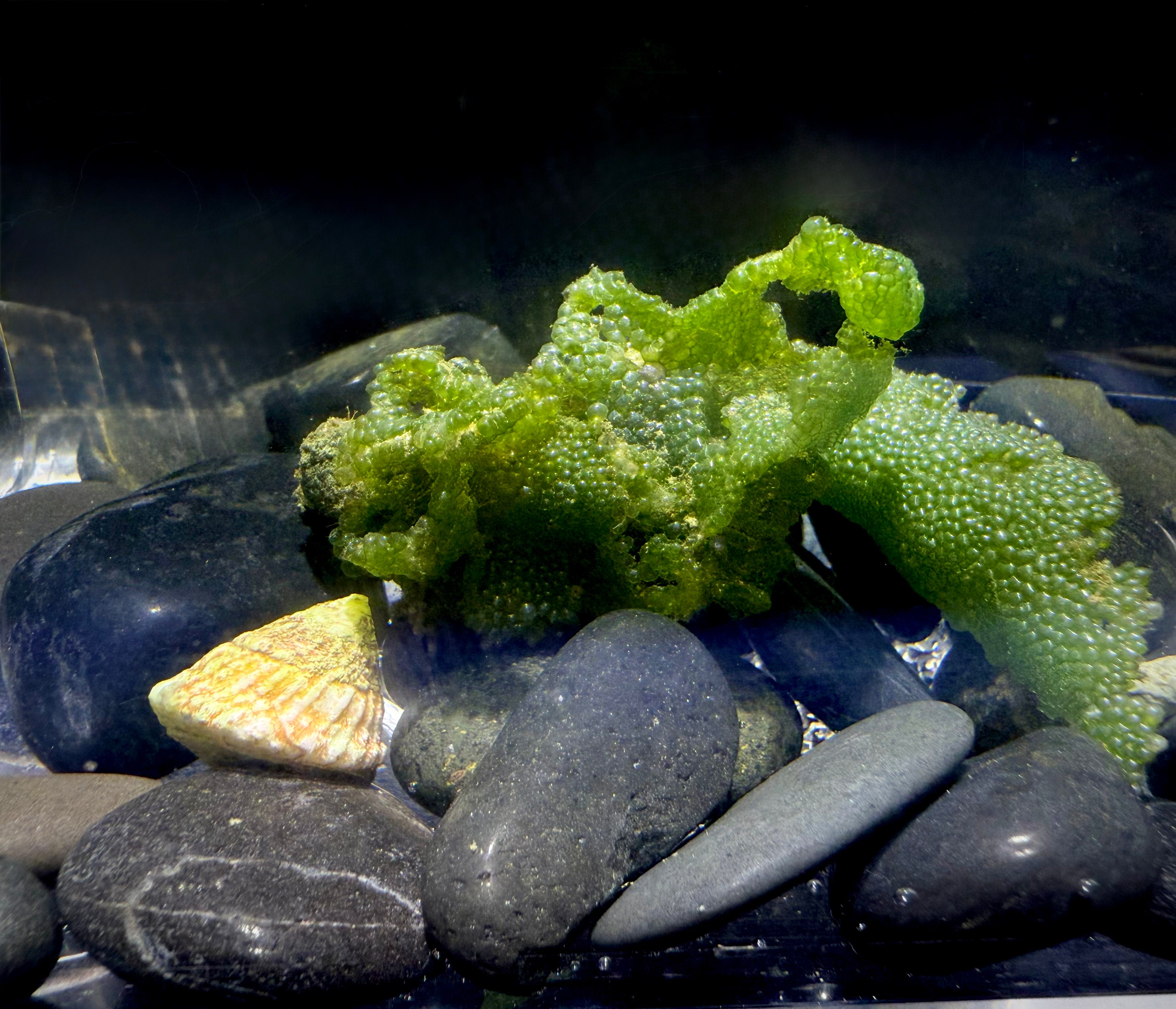 It isn't Bubble Algae (Valonia)!!! It is a rigid, highly variable green macro algae. It features lightly calcified, rounded, stiff, irregular shaped lobes that have a distinct pattern of intricate veins when examined closely. Its found attached to rocks and rubble in fairly shallow habitats sometimes very close to the shore. Most collected specimens are usually only a few inches in diameter as it can be difficult to extract from the substrate. It is a fairly hardy specimen in the marine aquarium but can take over the rock work.